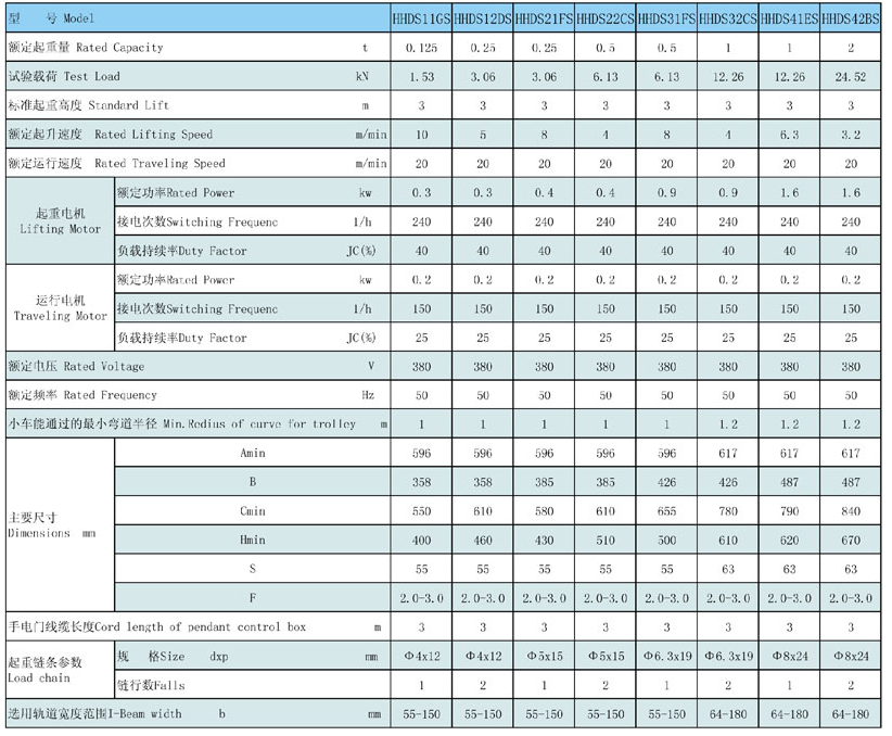 電動小車式環(huán)鏈電動葫蘆(0.5t-5t)參數(shù)表:
